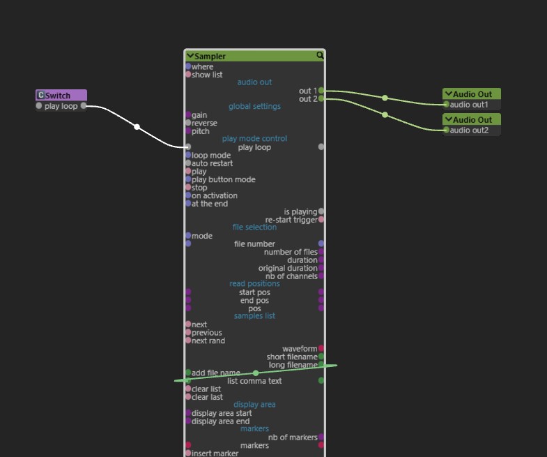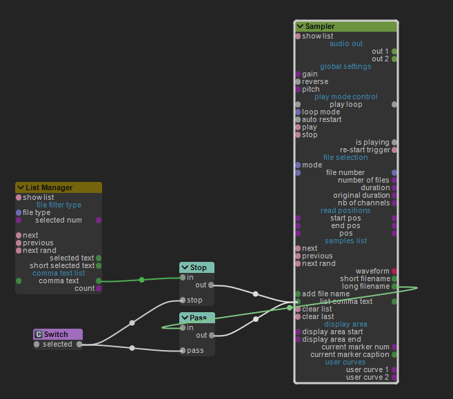Il y a un truc radical qui peut te faire gagner du temps. Une fois que tu as choisi le son (unique) de ton sampler dans la liste, tu relies la sortie "long filename" à l'entrée "list coma text".