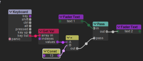 The problem here, which I never know how to solve, is that if I put a PIC module before the text 2 fader, then change the text 2 fader value, and want to update it back to the old text 1 value, the PIC module doesn't see a change, and nothing happens. If I don't add a PIC, then I can't change the value of text2 at all.
