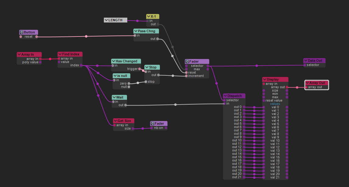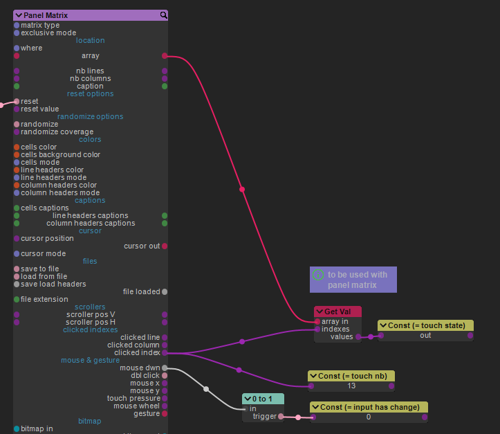 please note that the part that goes from the array output of the matrix is just here because I plan to use this patch with an OSC interface.