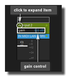 The rack input panel is where set inputs of the rack. Drag & Drop any input devices (audio, MIDI, Video), patches, racks you want to use as input for the current rack.